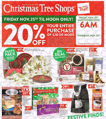 $10 off coupon via email when you sign up with Christmas Tree Shops. Christmas Tree Shops Weekly Ad. 24% off Christmas Tree Shops gift cards.Christmas Tree Shops Black Friday 2016 DealsChristmas Tree Shop, despite its name, is open all year round. They are well known for great bargains, and closeouts on exciting merchandise. They haven’t made it to the West Coast yet, but they are all around the New England and Mid Atlantic areas. The Christmas Tree Shop is one of the best places to go for discounts and special offers. The deals on Black Friday 2016 are even better. The Christmas Tree Shop Black Friday 2016 ad was just leaked online. It doesn’t look like the Christmas Tree Shop will be open on Thanksgiving, but they will be open at 6am on Black Friday with many great bargains at their locations all over the East Coast. They have doorbusters that are available until supplies last, or until the sale ends on November 27th. The 20 % off total purchase more than $20 is only good until noon on Black Friday 2016.