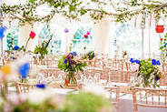 See The Ultimate Garden Wedding Checklist Ropes of leaves were strung up overhead to lend a natural touch to the tent at this South Carolina celebration at the Inn at Palmetto Bluff. The garlands were echoed in miniature as sprigs of rosemary that topped the linen napkins within the place settings. At this formal New York bash, this couple perched a faux white peacock into the peak of their Sperry tent, along with overflowing flowers and greenery. A fantastic setup awaited inside the tent for this couple's reception in Michigan. Clear shelves suspended above the long tables and held votive candles, assorted lanterns, and a variety of crab apples, green millet, and birch branches. Greenery and Hanging Bulbs American, Italian, Irish, and Swedish flags fluttered brightly above the white reception tent from Newport Tent Company at this soirée in Rhode Island. "It was a fun way to bring it back to who we are and where we come from," says the bride. Beneath the canopy was a modern assortment of tables and chairs, with the head table highlighted by an arrangement of wooden branches, orchids, and lights that twinkled from above.