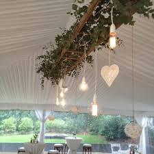 Above the tableau they added petite chandeliers encased within a sculptural orb for an old-world-meets-new touch. A tent draped with natural-toned, gauzy fabric accommodated guests for the reception at this Michigan celebration. Three oversized chandeliers were affixed from above and adorned with seasonal birch branches, moss, and smilax vine. Wedding planner Chelsey, from Gather Together, worked with Party Reflections, the rental company, to provide a hanging table for the wedding cakes. Ivy wrapped around the table's chains. "I loved how unique it was and how it gave the extra vertical lines to the tent," said the bride. Above the cake table hung a chandelier crafted by Party Tables out of old wine barrels. See More Amazing Dessert Tables Votive candles illuminated a canopy of grapevine arbor at this formal wedding in the New York Botanical Garden. This reception took place in a tent decorated with lanterns in the bride's parents' backyard in New Jersey. The reception tent at this wedding occupied a wooded area of the garden and featured a chandelier of greenery hung inside.